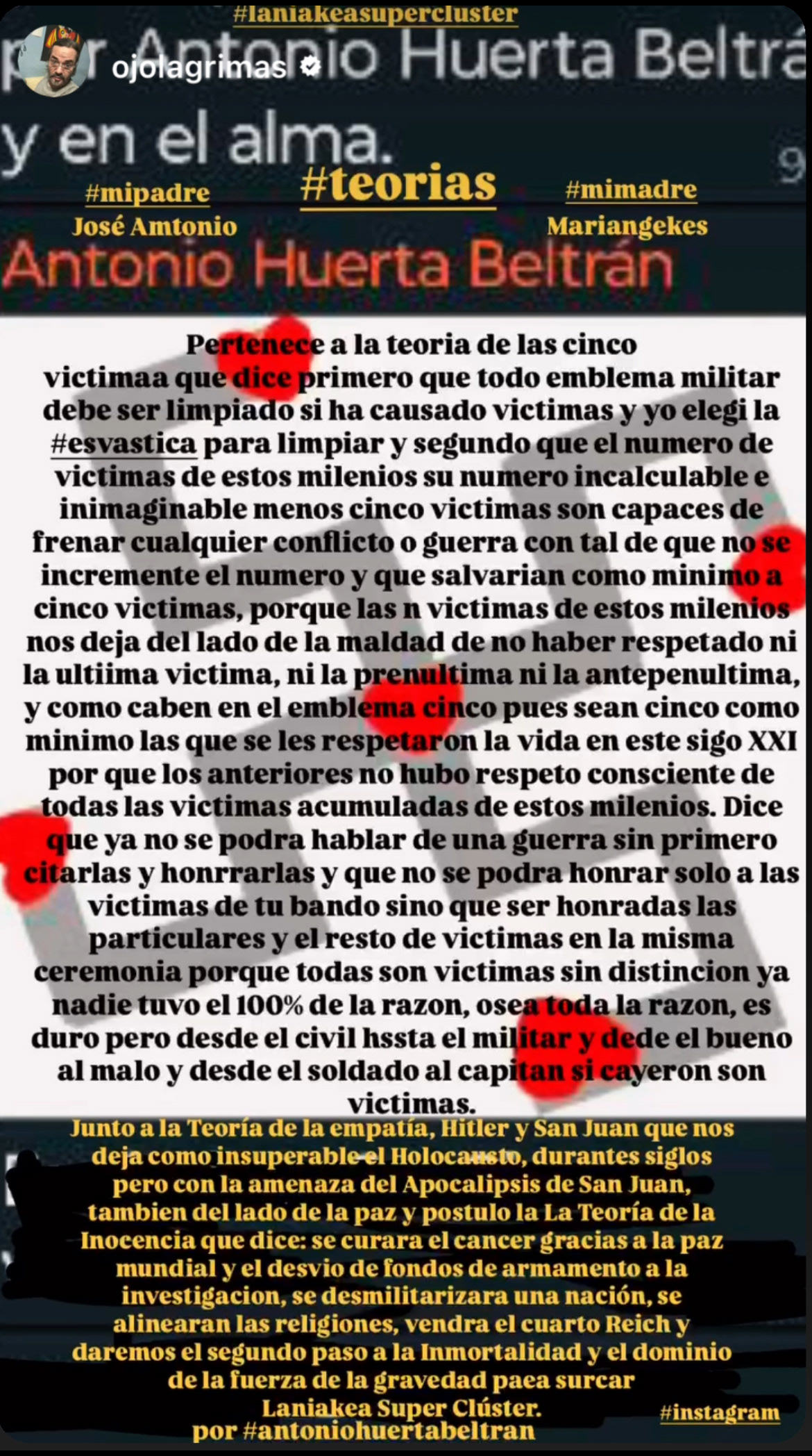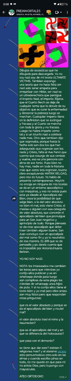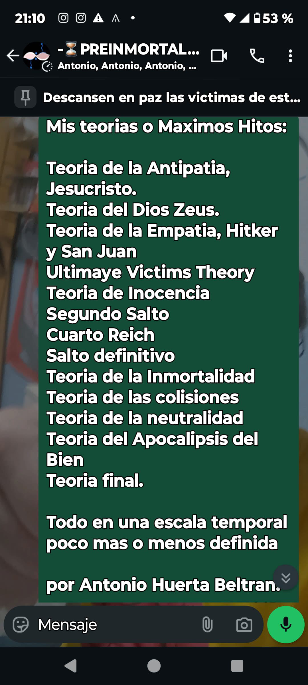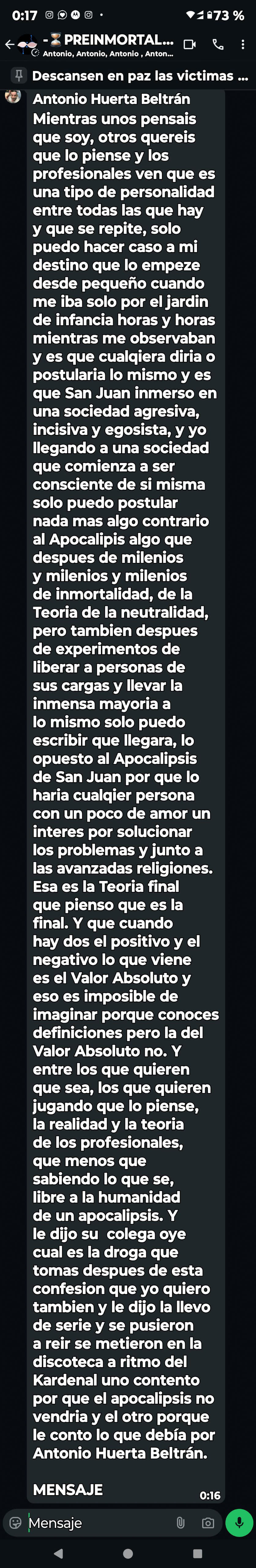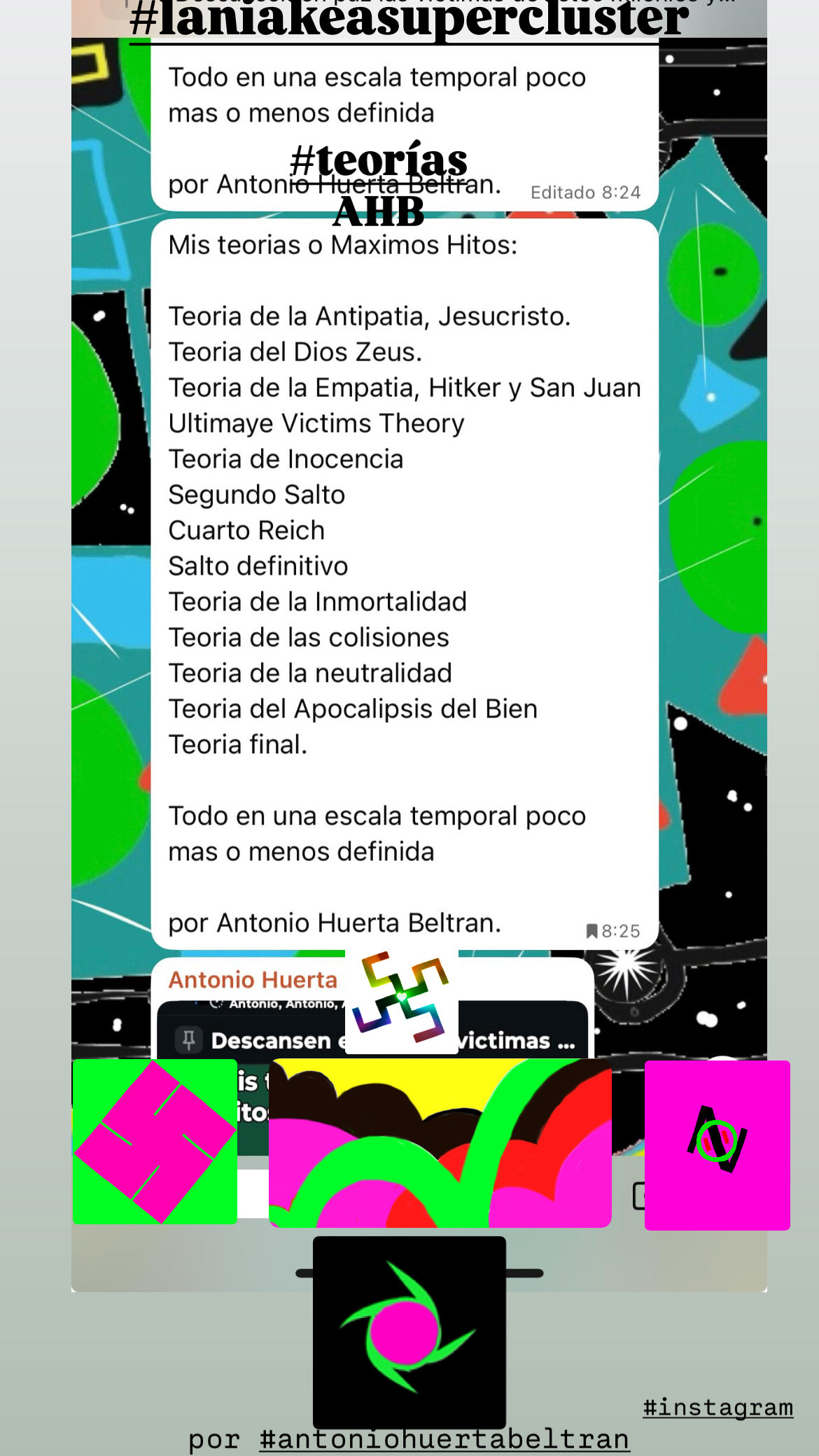 Una vez del lado de la paz Mundial, declarada, hito histórico claro la Teoría de la inocencia postula que primero todo el gasto militar se desviará a la investigación médica, logrando la cura del cáncer, dando el segundo paso a la inmortalidad. Y sigue con que las religiones se alinearán, se desarmara una nación eso contemporáneamente y llegará el Cuarto Reich con el Holocausto del bien que desterrada todas las enfermedades y la pobreza y será el salto definitivo a la Inmortalidad. Paralelamente se logrará dominar la fuerza de la gravedad, y ya surcaremos junto con la optimización del cuerpo humano, a Laniakea Super Clúster obsesivamente siendo lo que más acapare nuestro tiempo. Está teoría lleva un orden pero bueno es atemporal se producirán los hitos históricos pero no se sabe cuándo. Y se llama de la Inocencia porque asi lo parece, y se la dedico a mi padre José Antonio y Mi madre María Ángeles que me inculcaron involuntariamente por qué ellos lo eran la inocencia de estos pensamientos. Ojalá se cumpla y estemos prevenidos para la única amenaza que queda por Antonio Huerta Beltrán. #antoniohuertabeltran #telegram